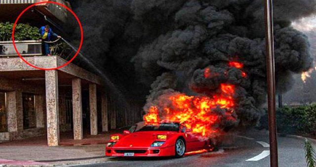 Ferrari alev alev yandı sahibi bahçe hortumuyla söndürmeye çalıştı