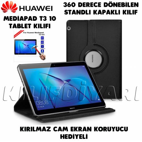 Huawei MediaPad T3 10 Kılıf 9.6 inç 360 Derece Dönebilen Standlı Kapaklı | Kırılmaz Cam Hediyeli